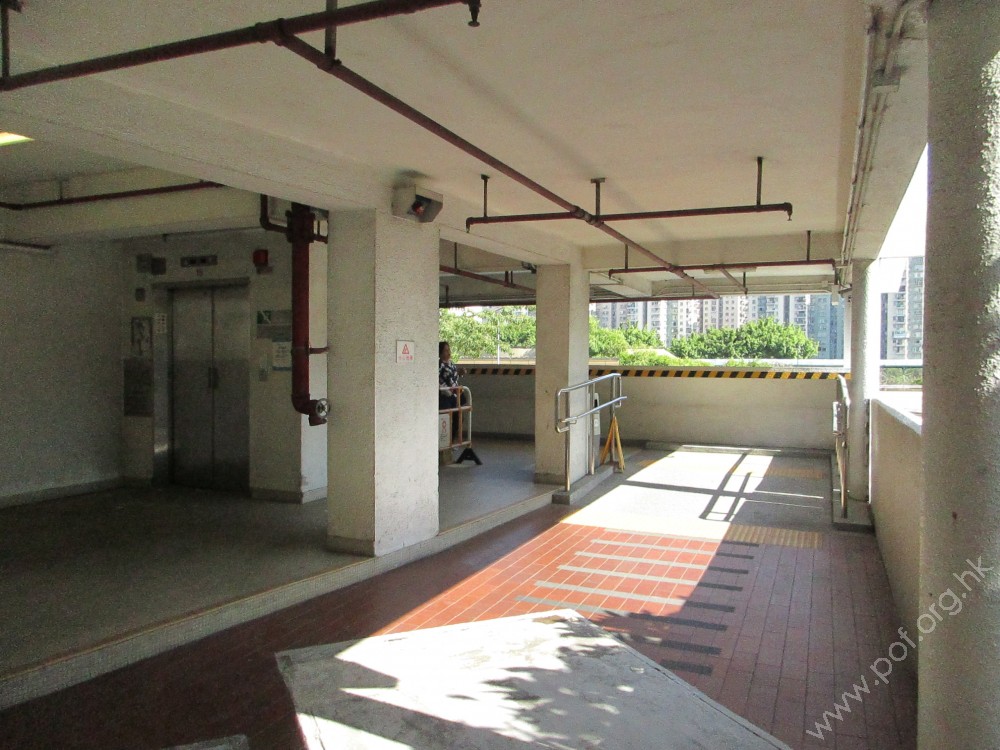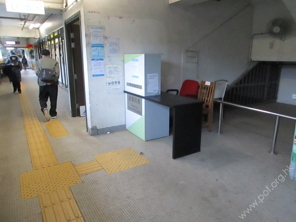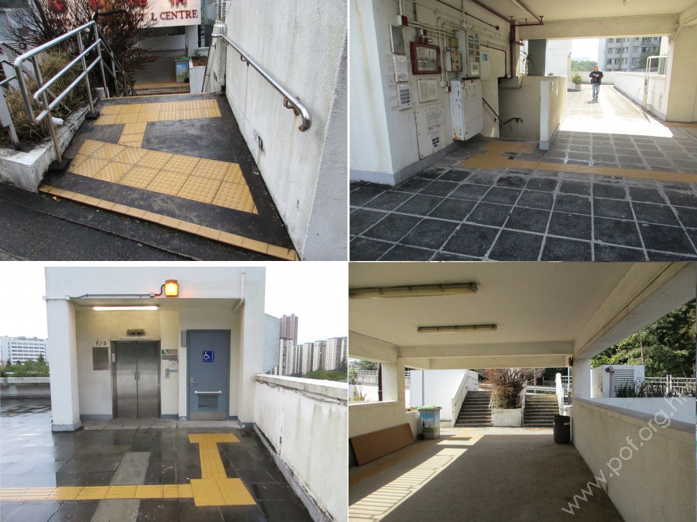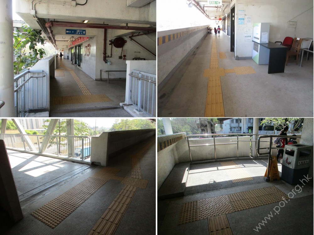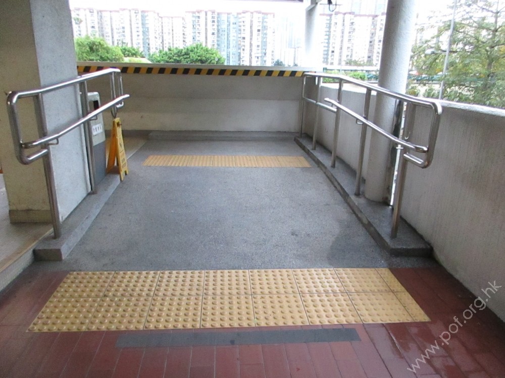 商場走廊與屋邨通道之間有一級梯級障礙,通道的一邊設有一條斜道輔助上落,斜道的兩邊設有扶手。有一條觸覺引路帶由斜道的頂部開始引向商場。