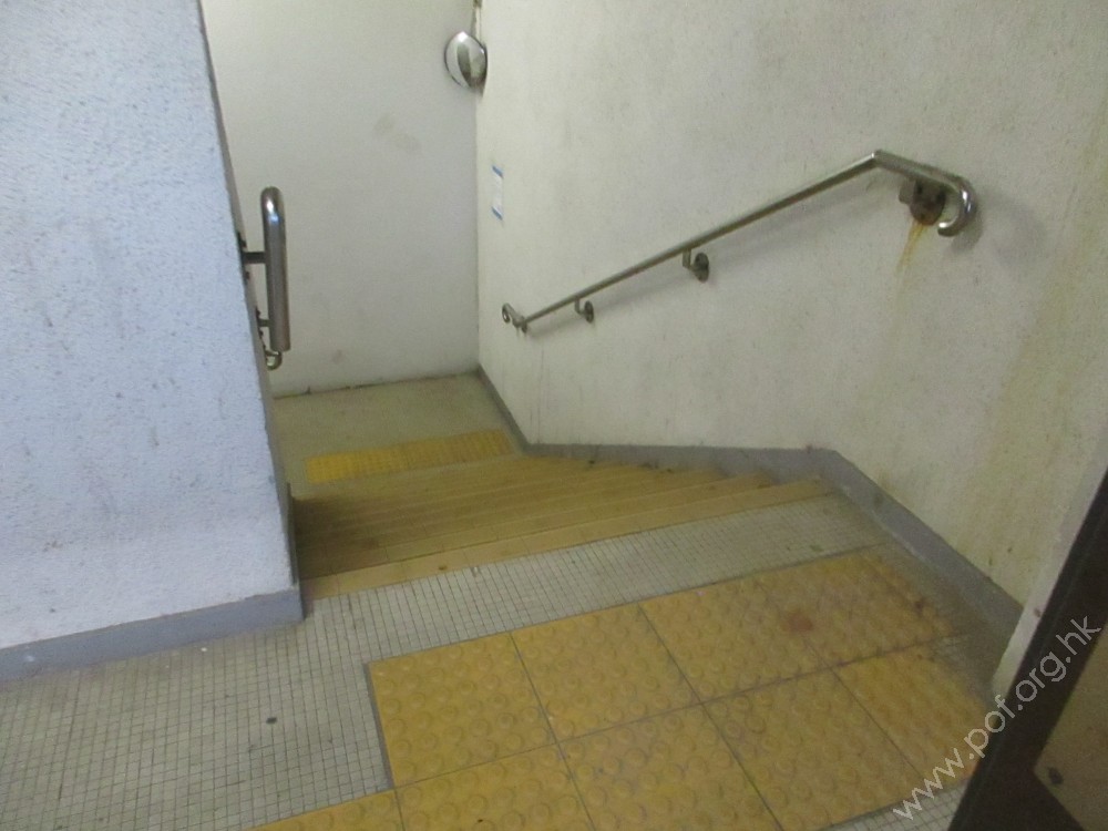 兩條梯級并列而設,均為一段,踏板闊度與豎板高度適中,兩邊裝有扶手,頂底兩端設有觸覺警告帶。