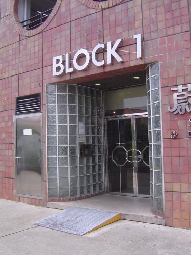 連接行人路,通道寬闊,前臨一級台階,前設一塊簡陋斜板輔助出入,無觸覺引路徑,門是不綉鋼框茶色玻璃對開推門,需輸入密碼開啟.