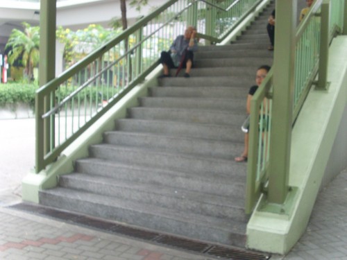 通道是多段數級梯級,段之間有平面,兩旁設有欄杆及扶手,底頂和平面無觸覺警告帶.