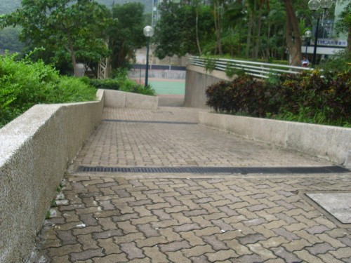 通道是由多段寬闊頗斜及長的斜道所組成,段之間有平面,地面是由細面積的磚塊鋪成,略有不平,兩旁只有綠化帶的矮牆而沒有扶手,無觸覺警告帶.