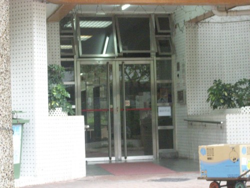 通道寬闊微斜無障礙,兩旁設有扶手,兩扇密碼玻璃門,無觸覺引路帶.