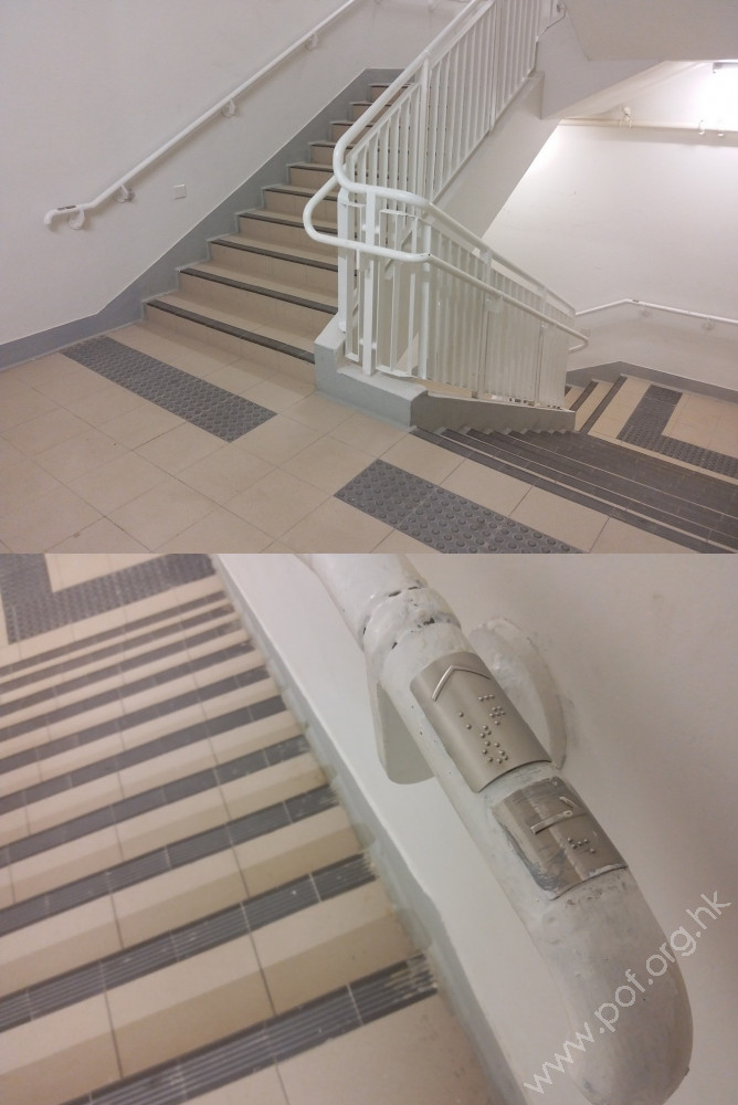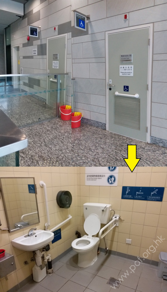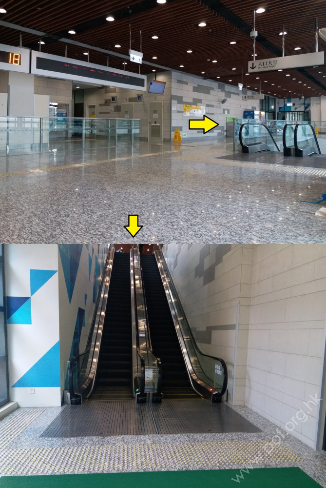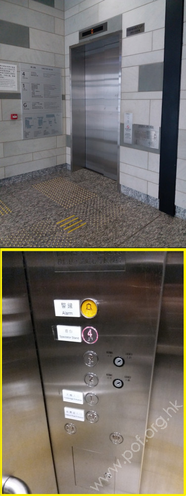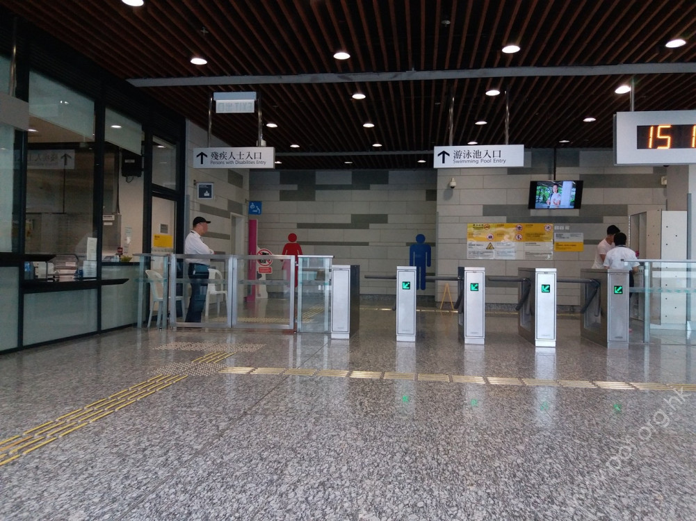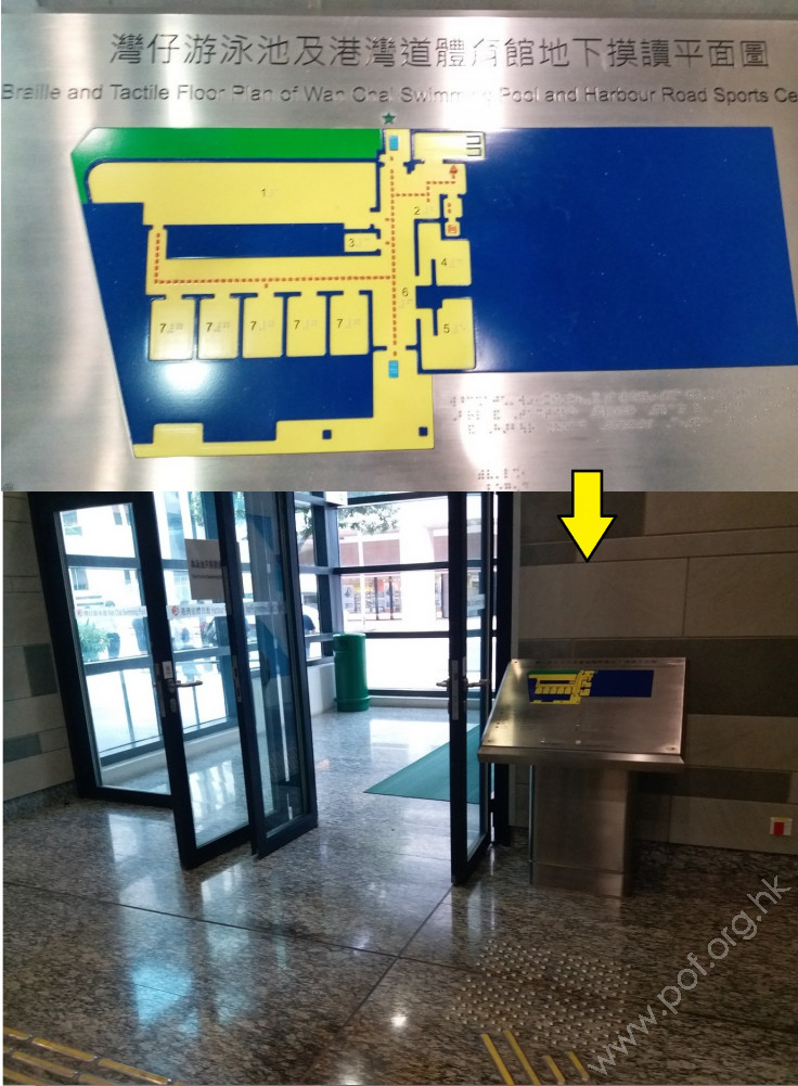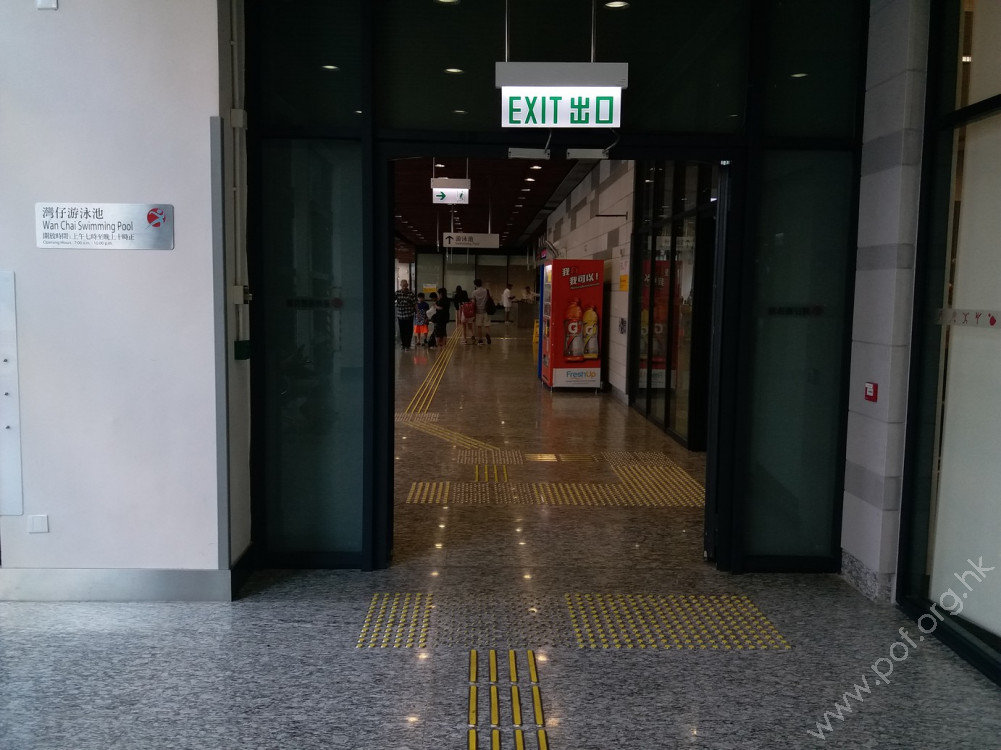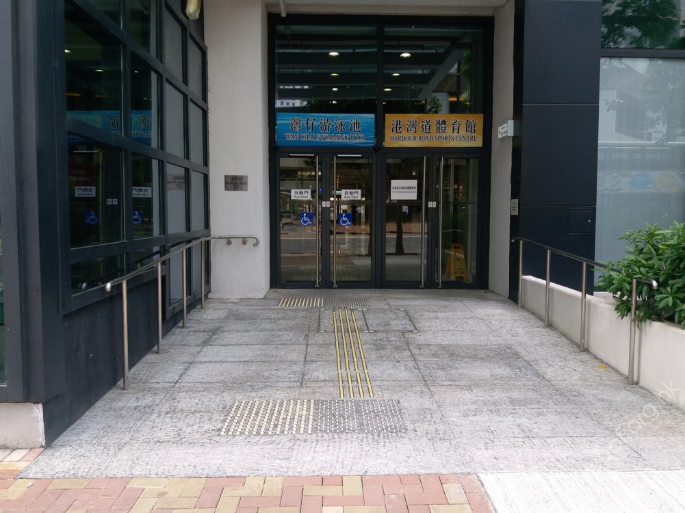 通道闊3.9米,設有微斜的斜道,兩邊有不銹鋼扶手,上方註明「灣仔游泳池」及「港灣道體育館」,入口設有兩道並排的金屬框對開玻璃拉門,左邊是自動門,兩扇門上貼有國際暢通易達標誌及「自動門」字樣,門打開後淨闊1.2米,金屬的觸覺引路帶由斜面底端開始伸延至自動門前斷開,再由門後導引至摸讀平面圖前、2號無障礙兼消防升降機門前、簽場處櫃台前、暢通易達更衣室及洗手間門前等設施。