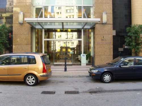 通道寬闊,與人行道之間設有多條矮的黑色鐵柱.大廈入口處(門檻)則有1級臺階,密碼玻璃門.