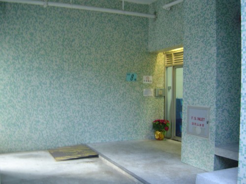 連接屋苑有蓋行人路,通道寬闊無障礙,前臨一級台階,台階旁連接寬闊平坦無障礙的通道走廊,無觸覺引路徑,門是鋁框玻璃對開推門,需輸入密碼開啟.