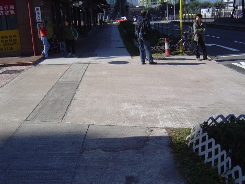 連接汽車路旁行人路,通道寬闊無障礙,前臨下斜路邊石,兩旁行人路無觸覺引路徑.