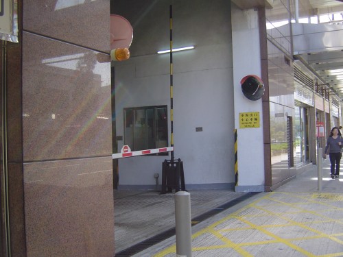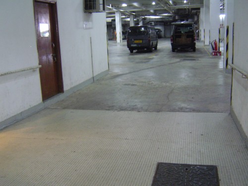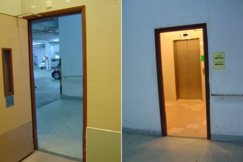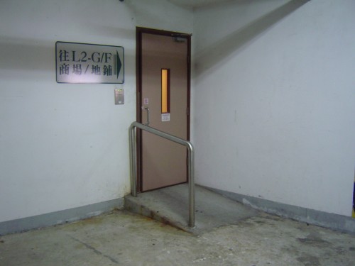連接升降機及地面停車場層,通道只有一扇門闊度,前臨斜道,無觸覺引路徑,門是棕色單邊防煙木門,門後是升降機大堂.