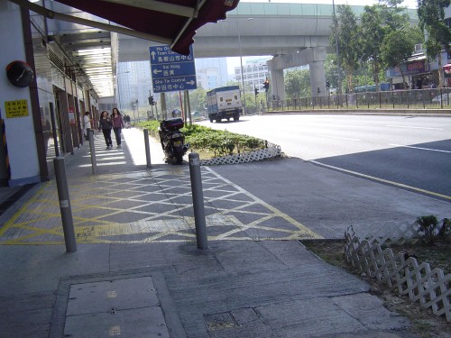 連接屋苑汽車路,通道寬闊平坦無障礙,屋苑汽車路連接汽車路,前臨下斜路緣,兩旁是行人路,無觸覺引路徑.