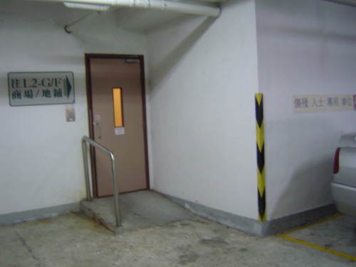 位於4號升降機往來停車場通道旁,面積與普通車位相同,車位末端牆壁上有文字標明是供障殘人士使用的停車位.