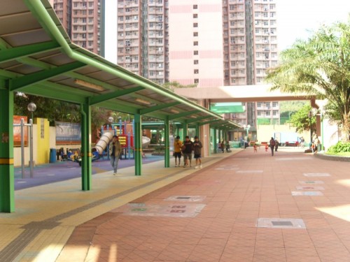 通道寬闊,開放式設計,微斜,屋邨的主要公共通道有蓋及有觸覺引路帶..