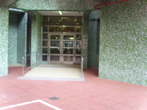通道是寬闊的斜道,斜度不大,兩邊有扶手,底頂兩端有觸覺警告帶.設有兩扇密碼玻璃門.無觸覺引路帶.