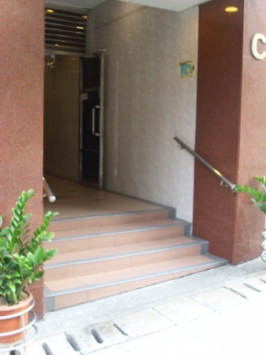 通道寬闊,有4級梯級.兩邊有扶手,底頂無觸覺警告帶.大廈設有密碼鐵閘.