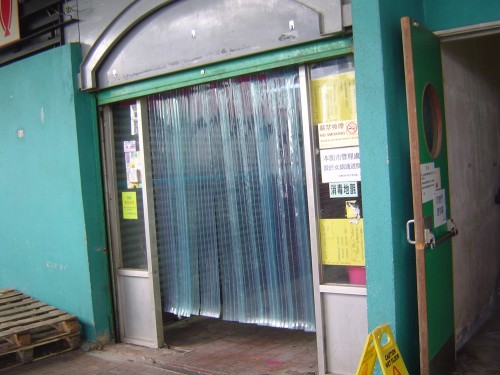 連接屋邨有蓋行人走廊,通道寬闊平坦無障礙,無觸覺引路徑,旁是另兩個出入口,通道口掛有透明塑膠布.