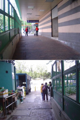 連接屋邨有蓋行人走廊,通道寬闊平坦無障礙,無觸覺引路徑,旁是另兩個出入口,通道兩旁擺滿貨物.