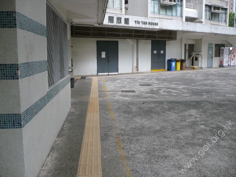 住宅正門閘門前設有黃色觸覺引路帶,向前沿住宅前的屋邨行人路伸延,轉向往住宅及商場伸延。
