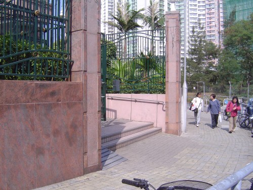 連接往來港鐵車站的行人路面,通道寬闊,前臨兩級梯級,旁設斜板輔助出入,無觸覺引路徑,閘門是綠色金屬支架單邊閘門,共有兩度閘門並排,需輸入密碼開啟.
