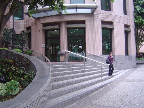 連接出入口與汽車路旁行人路高低位置,共有八級踏板,頂底兩端無觸覺警告帶,兩邊及中間設有扶手,一邊固定在出入口旁牆壁上,另一邊固定在弧形花圃矮壆上,中間兩條平行固定在支架上,支架固定在踏板上,牆壁灰色凹凸坑紋無凸出物,踏板灰色.