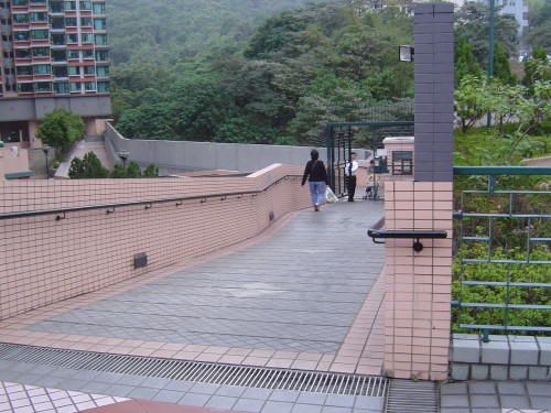 連接連接停車場L7天台層與住宅出入口高低位置,斜道非常寬闊,斜度略高,中間有一段平面,頂底兩端及平面無觸覺警告帶,兩邊設有扶手,固定在粉紅色矮牆上,矮牆無凸出物,踏板灰色.