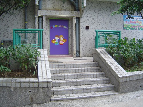 連接廣柏樓地面的行人路,門前臨一級台階障礙,無斜道輔助,無觸覺引路徑,門是紫色單邊木門.
