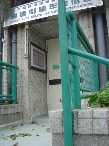 連接屋邨地面行人路,通道寬闊,前臨一級台階障礙,無斜道輔助,無觸覺引路徑,門是玻璃對開推門.