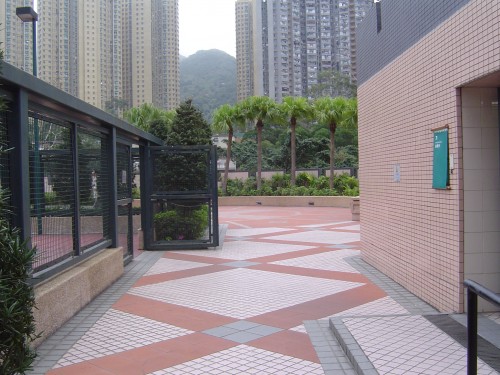 連接往來住宅通道與往來升降機出入口,通道是寬闊平坦無障礙的露天行人路,無觸覺引路徑,旁是籃球場.