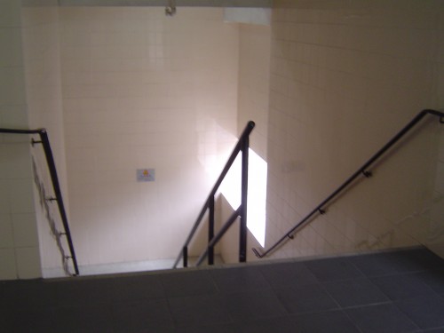 連接升降機旁樓梯,通道只有一扇門闊度,位於升降機可到達的兩層樓層之間,需用樓梯連接,無斜道輔助,無觸覺引路徑,門是白色單邊木推門,共有兩度推門前後並排.
