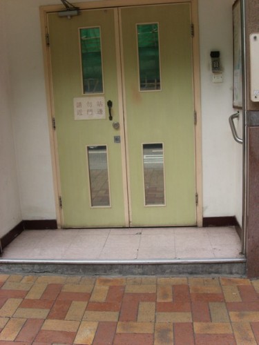 通道寬闊,有一級梯級,僅一邊有一條短扶手固定於牆壁上,兩扇手推式木門,無觸覺警告帶.