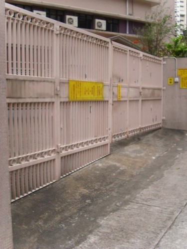 通道寬闊,微斜,設有粉紅色鐵閘,水泥地面,無扶手及觸覺引路設施.