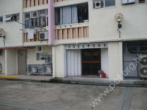 連接商場3樓天台露天天台行人路,通道是寬闊的教會單位正門,前臨一級台階障礙,無斜道輔助,無觸覺引路徑,門是棕色金屬框架對開玻璃推門.