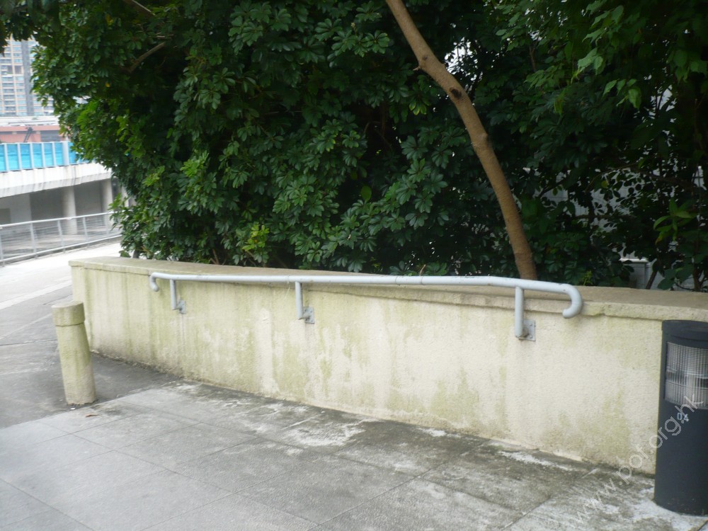 是管狀灰色金屬扶手,高0.85米、直徑闊50毫米,兩邊固定在兩邊矮牆上,頂底兩端有平行地面伸延設計,無觸覺點字或凸字資料標誌。