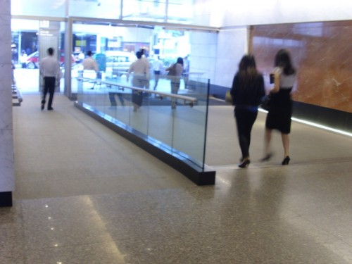 斜道闊過1.05米,角度不大,兩邊有扶手分別固定於牆上和半高的玻璃矮牆上,底頂無觸覺警告帶.