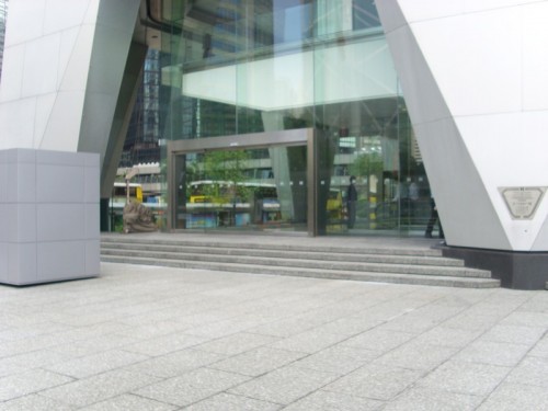 通道是寬闊的4級梯級,踏板寬且矮,兩邊和中間都無扶手,底頂無觸覺警告帶.大廈入口設有自動玻璃門.
