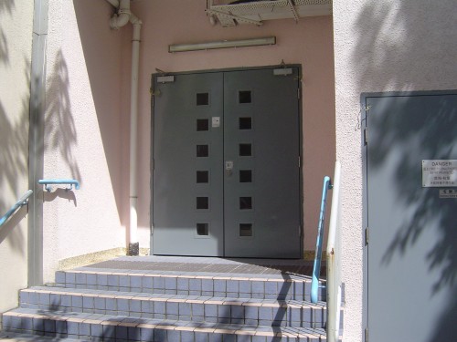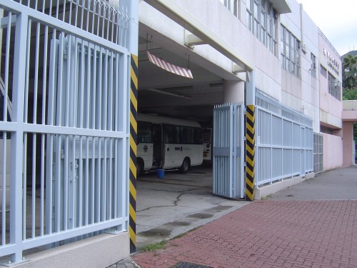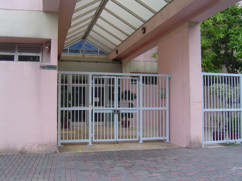 連接汽車路旁行人路,通道是寬闊平坦無障礙的正門,無觸覺引路徑,門是鋁質框玻璃對開推門,門前淺藍色金屬框對開閘門.