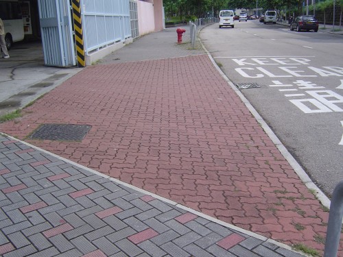 連接汽車路旁行人路,通道是寬闊平坦無障礙的汽車出入口,前臨下斜路緣,面邊行人路無觸覺引路徑.