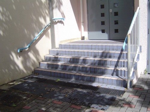 連接出口與汽車路旁行人路高低位置,共有五級踏板,頂底兩端設有黑色觸覺警告帶,兩邊設有扶手,一邊固定在米白色欄杆上,欄杆旁無牆壁,另一邊固定在米黃色外牆上,外牆無凸出物,踏板藍色.