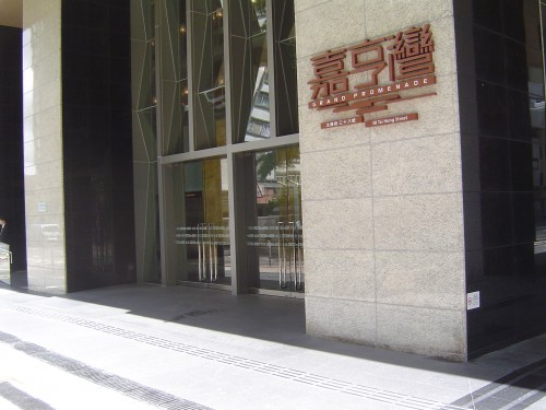 連接汽車路旁行人路,旁是屋苑斜道出入口,通道是寬闊平坦無障礙的屋苑正門,無觸覺引路徑,前有金屬色觸覺引路徑橫過,連接旁斜道出入口,門是玻璃對開推門,共有兩度玻璃門並排.