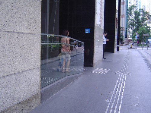 連接出入口與汽車路旁行人路高低位置,斜道前設有藍色國際暢通易達標誌,斜道闊度一般,斜度不高,頂端設有金屬色觸覺警告帶,底端設有金屬色觸覺警告帶連位置磚,連接同色的引路徑,兩邊設有扶手,一邊固定在玻璃矮幕牆上,另一邊固定在住宅外牆玻璃幕牆凸出的支架上,支架是凸出物,踏板灰色.