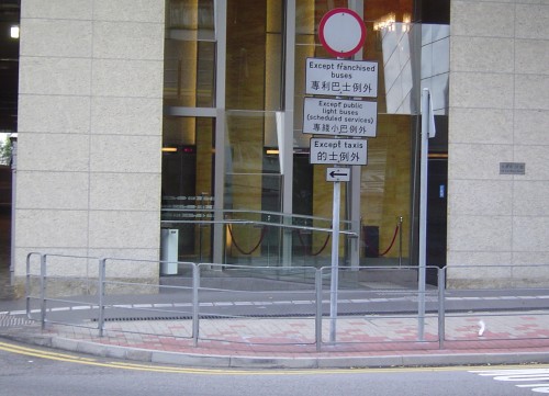 是金屬色圓條形,一邊固定在玻璃矮幕牆上,另一邊固定在住宅外牆玻璃幕牆凸出的支架上,只頂端有平行地面伸延設計,底端無,及有觸覺點字或凸字資料標誌.