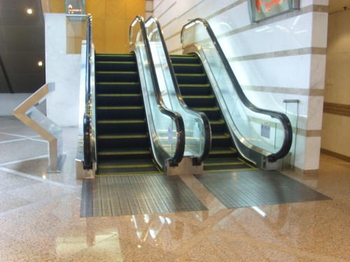 通道是自動電梯和梯級並排而設,自動電梯有上有落,無發聲訊號,底頂無觸覺警告帶.梯級爲2段13級,段之間有平面,兩邊有玻璃防護帶和扶手,底頂和平面都無觸覺警告帶.