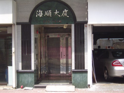 連接汽車路旁行人路,通道是寬闊的走廊通道,正門是一扇門闊度,前臨一級台階障礙,設有一塊臨時木斜板輔助,無觸覺引路徑,門是不綉鋼框玻璃單邊推門.