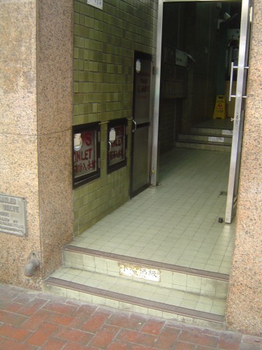 連接正門閘門與汽車路旁行人路,共有兩級踏板,頂底兩端無觸覺警告帶,兩邊無扶手,兩邊牆壁是門廊,淺棕色雲石材無凸出物,踏板淺綠色.