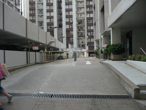 連接屋苑汽車路,通道是寬闊平坦的汽車路及汽車出入口,兩旁行人路凸出汽車路,有梯級障礙,無斜道輔助,無觸覺引路徑.