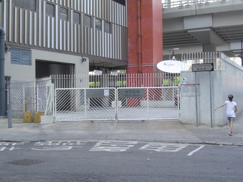 連接汽車路及兩旁行人路,通道是寬闊平坦無障礙的汽車出入口閘門,前臨下斜路緣,兩旁行人路無觸覺引路徑,閘門是白色金屬支架對開大閘門,進入後是往來住宅三樓平台的升降機.