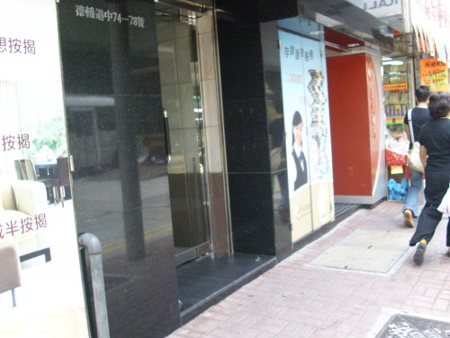 通道寬過1.05米,有一小級梯級,設有手推玻璃門.無觸覺引路設施.