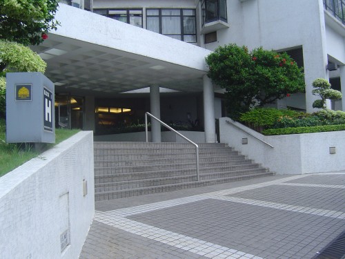 連接正門前平台行人路與汽車路旁行人斜路高低位置,共有八級踏板,頂底兩端無觸覺警告帶,兩邊設有扶手固定在兩邊花槽矮牆上,中間一條欄杆形固定在踏板上,矮牆白色無凸出物,踏板棕色為主.