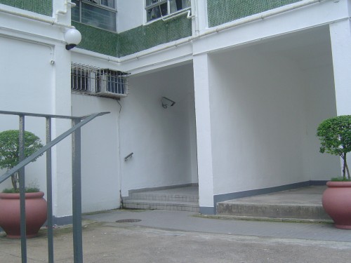 連接正門前行人空間與汽車路旁平台行人路高低位置,共有兩級踏板,頂底兩端無觸覺警告帶,單邊設有扶手固定在住宅外牆上,外牆白色無明顯凸出物,踏板淺灰色.