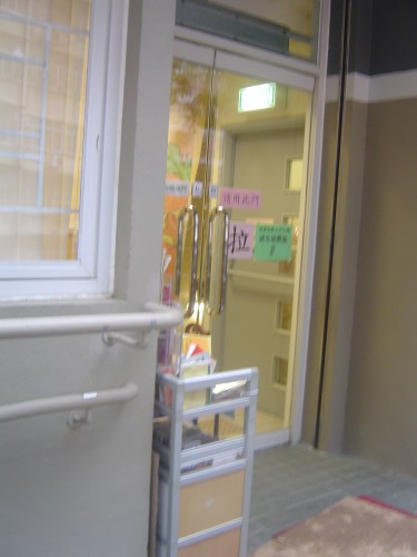 連接往來汽車路旁行人路的建築物外圍平台行人路,通道是寬闊平坦無障礙的正門通道,前臨一條左右兩端相向的斜道,無觸覺引路徑,門是玻璃對開推門.