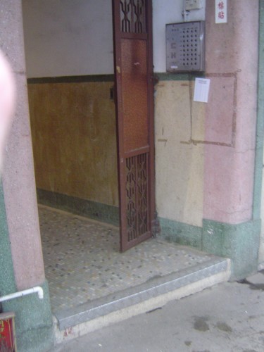 連接汽車路旁行人路,通道是寬闊的出入口閘門,閘門只有一扇門闊度,前臨一級台階障礙,無斜道輔助,無觸覺引路徑,閘門是不綉鋼面框架單邊閘門,設有對講機聯絡開啟.