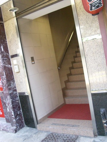 通道寬度不足1.05米,離地先有一級,往內又是兩段梯級。僅門內的梯級有扶手。都無觸覺警告帶。