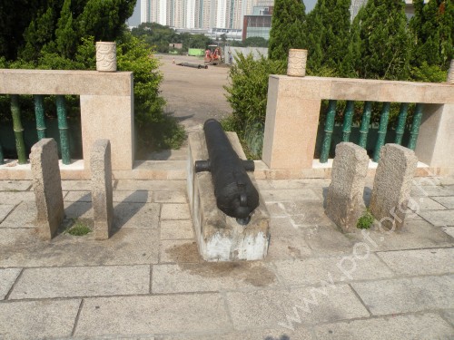 昔日屏山的水道與碼頭消失,原有的墟市曾搬到宗祠經營,最後式微,僅餘數個攤檔標示墟市的痕跡。 | 宗祠前躺著的一尊古炮,據說是當年村民反抗英軍接收新界時用過的火器,尊為「香港第一英雄炮」。 |